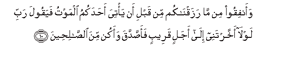 10. Waanfiqoo min ma razaqnakum min qabli an ya/tiya ahadakumu almawtu fayaqoola rabbi lawla akhkhartanee ila ajalin qareebin faassaddaqa waakun mina alssaliheena
