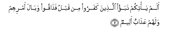5. Alam ya/tikum nabao allatheena kafaroo min qablu fathaqoo wabala amrihim walahum AAathabun aleemun