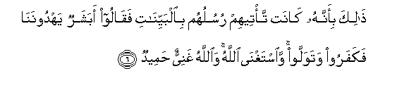 6. Thalika bi-annahu kanat ta/teehim rusuluhum bialbayyinati faqaloo abasharun yahdoonana fakafaroo watawallaw waistaghna Allahu waAllahu ghaniyyun hameedun