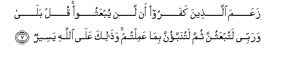 7. ZaAAama allatheena kafaroo an lan yubAAathoo qul bala warabbee latubAAathunna thumma latunabbaonna bima AAamiltum wathalika AAala Allahi yaseerun