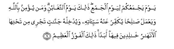 9. Yawma yajmaAAukum liyawmi aljamAAi thalika yawmu alttaghabuni waman yu/min biAllahi wayaAAmal salihan yukaffir AAanhu sayyi-atihi wayudkhilhu jannatin tajree min tahtiha al-anharu khalideena feeha abadan thalika alfawzu alAAatheemu