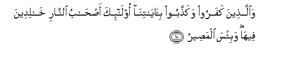 10. Waallatheena kafaroo wakaththaboo bi-ayatina ola-ika as-habu alnnari khalideena feeha wabi/sa almaseeru