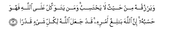 3. Wayarzuqhu min haythu la yahtasibu waman yatawakkal AAala Allahi fahuwa hasbuhu inna Allaha balighu amrihi qad jaAAala Allahu likulli shay-in qadran