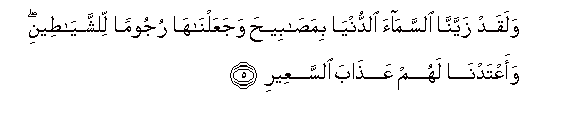 5. Walaqad zayyanna alssamaa alddunya bimasabeeha wajaAAalnaha rujooman lilshshayateeni waaAAtadna lahum AAathaba alssaAAeeri