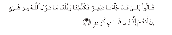 9. Qaloo bala qad jaana natheerun fakaththabna waqulna ma nazzala Allahu min shay-in in antum illa fee dalalin kabeerin