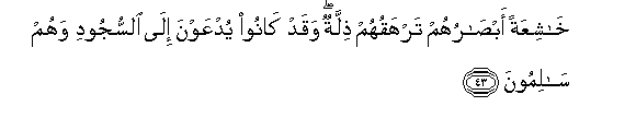 43. KhashiAAatan absaruhum tarhaquhum thillatun waqad kanoo yudAAawna ila alssujoodi wahum salimoona