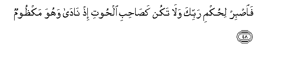 48. Faisbir lihukmi rabbika wala takun kasahibi alhooti ith nada wahuwa makthoomun