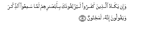 51. Wa-in yakadu allatheena kafaroo layuzliqoonaka bi-absarihim lamma samiAAoo alththikra wayaqooloona innahu lamajnoonun