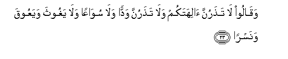 23. Waqaloo la tatharunna alihatakum wala tatharunna waddan wala suwaAAan wala yaghootha wayaAAooqa wanasran