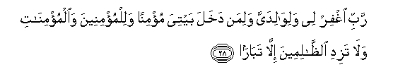 28. Rabbi ighfir lee waliwalidayya waliman dakhala baytiya mu/minan walilmu/mineena waalmu/minati wala tazidi alththalimeena illa tabaran
