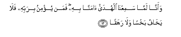 13. Waanna lamma samiAAna alhuda amanna bihi faman yu/min birabbihi fala yakhafu bakhsan wala rahaqan