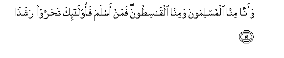 14. 'Amongst us are some that submit their wills (to Allah., and some that swerve from justice. Now those who submit their wills - they have sought out (the path) of right conduct: