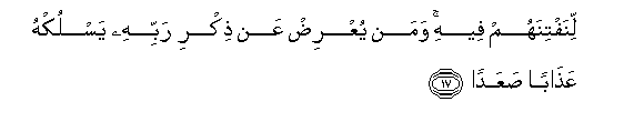 17. Linaftinahum feehi waman yuAArid AAan thikri rabbihi yasluk-hu AAathaban saAAadan
