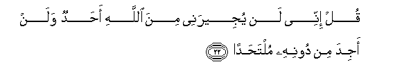 22. Qul innee lan yujeeranee mina Allahi ahadun walan ajida min doonihi multahadan