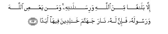 23. Illa balaghan mina Allahi warisalatihi waman yaAAsi Allaha warasoolahu fa-inna lahu nara jahannama khalideena feeha abadan