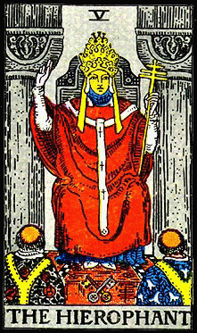 The Hierophant represents structured ritual used for linking the personal to the universal. The Hierophant is the "concealer of sacred things," and the one who reveals them to the initiate in the