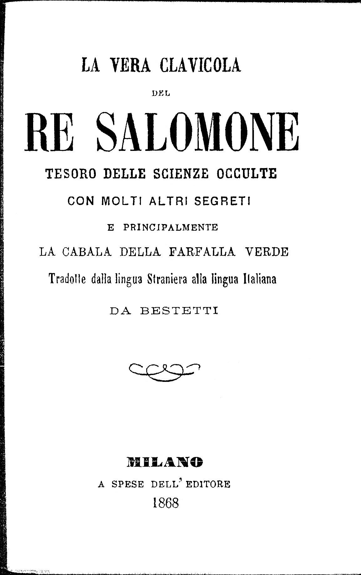 LA VERA CLAVICOLA DEL RE SALOMONE TESORO DELLE SCIENZE OCCULTE CON MOLTI ALTRI SEGRETI E PRINCIPALMENTE LA CABALA DELLE FARFALLA VERDE Tradotte dalla lingua Staniera alla lingua Italiana DA BESTETTI *** MILANO A SPESE DELL' EDITORE 1868 | |||||||||||||||||||||||||||||||||||||||||||||||||||||||||||||||||||||||||||||||||||||||||||||||||||||||||||||||||||||||||||||||||||||||||||||||||||||||||||||