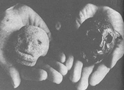 The first had a skull-like face, seemed to be masculine to everyone who saw it, and was dubbed the `boy'. It was of a greenish-grey colour, and glistened with crystals of quartz. It was very heavy - heavier than cement or concrete - with hair that appeared to be in stripes running from the front to the back of the head. The other head - the `girl' - resembled a witch, with wildly bulging eyes and hair that was combed off the forehead in what was almost a bun. There were also traces of a yellow or red pigment in her hair.