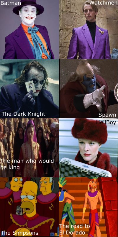 Below, are the many uses of "Purple and scarlet" and "The Lady in Red" in the movies covered by Full Disclosure. The colors purple and scarlet are usually associated with a powerful organization, and not always a single woman. Ozmandius and the Clown from spawn wear purple. Both jokers wear purple and red, where Jack Nicholson wears purple and scarlet specifically, and Heath Ledger wears purple on the outside, and red on the inside of his suit. In The man who would be king, Danny's future wife wears none other than purple and red. While in HellBoy, a female villian wears all red. In the simpsons, the "Stonecutters" ( a.k.a Freemasons ) have chosen Purple and Red ( and also a mixture of the two ). In The road to El Dorado, Michael, who has been mistaken for the sun god, also wears purple and red. Keep in mind how few movies, relative to the sum of cinema, Full Disclosure covers, and how many examples may be drawn from so few.