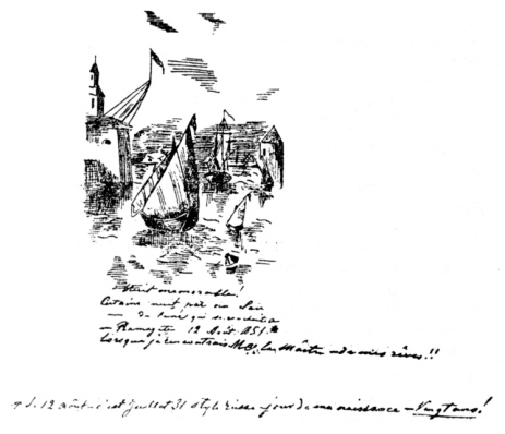 In her Reminiscences of H. P. Blavatsky and “The Secret Doctrine” (pp. 57-58) Countess Constance Wachtmeister relates an incident that occurred while H.P.B. was at Würzburg, Germany. It appears that Madame N. A. de Fadeyev, H.P.B.’s aunt, sent her from Russia a box containing various mementoes. Among these was the above-mentioned booklet which the Countess calls a “scrapbook.” H.P.B., on seeing the seaside sketch, gave an exclamation of delight and said: “Come and look at this which I wrote in the year 1851, the day I saw my blessed Master.” The Countess then quotes the exact French text written by H.P.B. under the sketch. She also adds in a footnote: “On seeing the manuscript I asked why she had written ‘Ramsgate’ instead of ‘London,’ and H.P.B. told me that it was a blind, so that anyone casually taking up her book would not know where she had met her Master, and that her first interview with him had been in London as she had previously told me.”