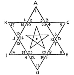 the uppermost head of the upper triangle formed the “Three Kabalistic Faces,” making up the twelve. Moreover, the twelve figures give two squares or the double tetraktys representing in the Pythagorean symbology the two worlds—the spiritual and the physical, the 18 inner and 6 central angles yield, besides 24, twice the sacred macrocosmic number, or the 24 “divine unmanifested powers.” These it would be impossible to enumerate in so short a space. Besides it is far more reasonable in our days of scepticism to follow the hint of Iamblichus, who says, that “the divine powers
