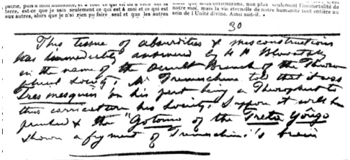 “This tissue of absurdities & misconstructions was immediately answered by H. P. Blavatsky in the name of the Occult Branch of the Theosophical Society; Mr. Tremeschini told that it was Très mesquin on his part being a Theosophist to thus carricature his Society. Suppose it will be printed & the ‘Gotomo of the Treta Yoûgo’ shown a figment of Tremeschini’s brain.”