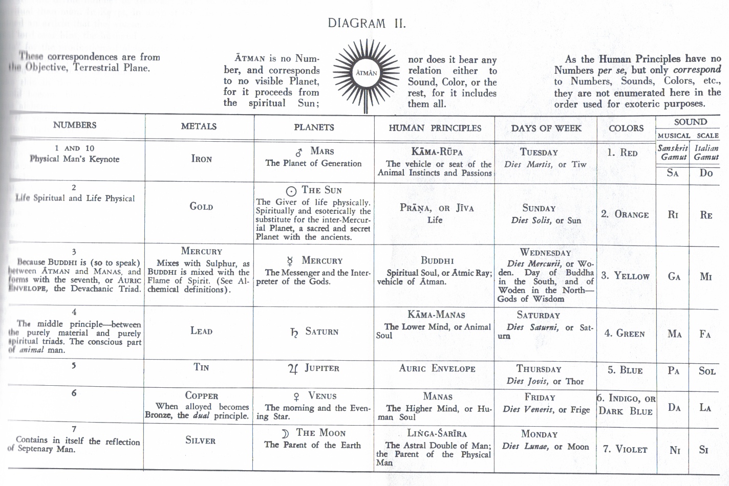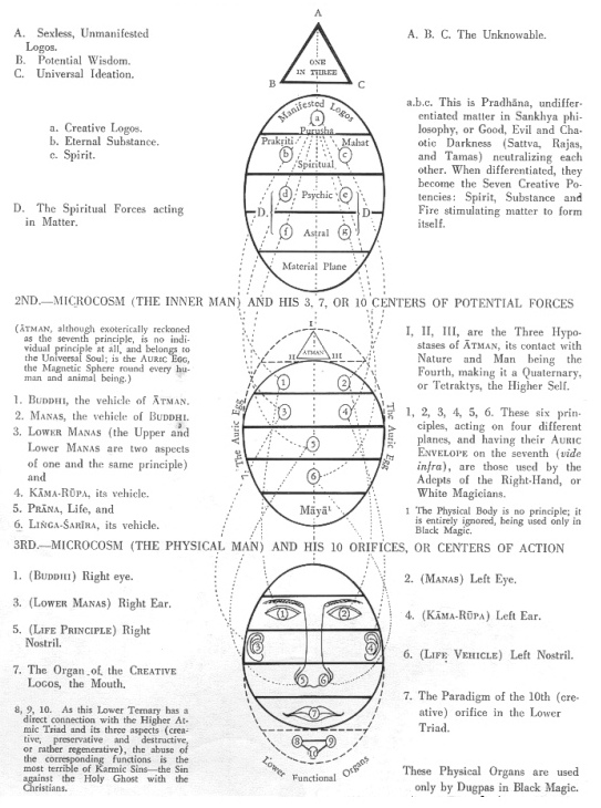 In Plate I, we see that ATMAN is no “principle,” but stands separate from the Man, whose seven “principles” are represented as follows: