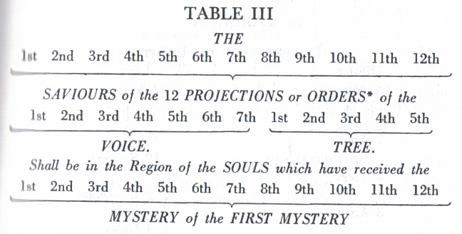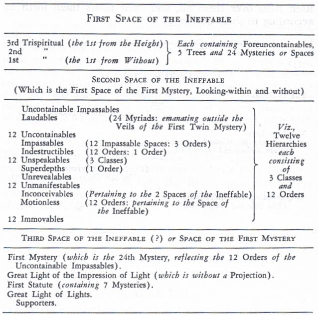 [PS 205] “And he who shall receive the Mystery of the Third Trispiritual, which pertains to the Three Trispirituals and Three Spaces, in their series, of the First Mystery, but has no power to go into the height into the Orders which are above him which are the Orders of the Space of the Ineffable (1) . . . .”