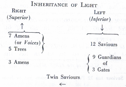 (4) [Their saviours.] Sc. of the Emanations or Projections. On pages 190 and 191 the scale of the twelve Saviours is given. The first seven preside over the projections or emanations of the seven Voices, Vowels, or Amens, and the last five over the five Trees; they are all of the Treasure of Light.