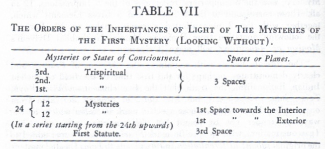 (1) Here we have a series or scale of 12, 7 (see Tables VII and VIII), 5 and 3 Mysteries, and the synthetic One and Only Mystery. The key to their interpretation will be found in the Transactions of the Blavatsky Lodge (Part I, p. 55)† where it says:—
