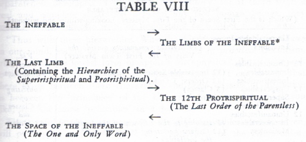 The careful student on comparing the different tables already given, will perceive a certain unity in the multiplicity of the Hierarchies; in other words that they are built up on an ever recurring type, which has been given in its simplest form in the Chart of the Valentinian Pleroma. Each new category transcends the one preceding it, until the mind totters in the sublimity of this stupendous scheme.