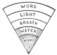 Above the waters the powerful breath of the Elôhîm; above the Breath the Light; above Light the Word, or the Speech that created it. We see here the spheres of evolution: the souls [?] driven from the dark centre (Darkness) toward the luminous circumference. At the bottom of the lowest circle is the Tohu-vah-bohu, or the chaos which precedes all manifestation [Naissances—generation]; then the region of Water; then Breath; then Light; and, lastly, the Word.