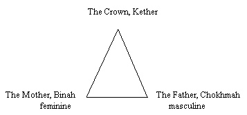 † If by “Ochmah” the Abbé means Chokhmah-Wisdom (sometimes phonetically written Hochmah), he is seriously deceived again. Hochmah is not “the feminine Principle” but the masculine, since it is the “Father,” Yah, while Binah, Intelligence or Jehovah, is the feminine Principle, “the mother.” Here is the superior triangle of the 10 Sephiroth: