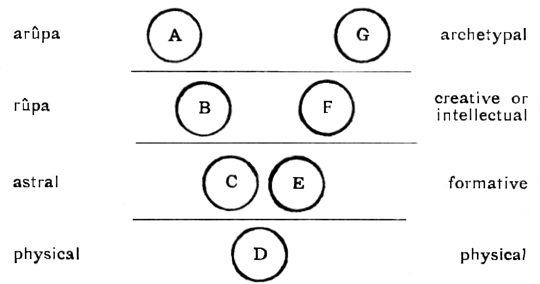 the physical and astral planes, and the two subdivisions of the mental (rûpa