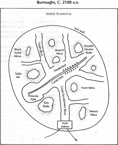 Again we struggle in the matrix of a new world, this time truly alien. Despite the great long glaciers left by the giant floods of 2061, it is a very arid world; despite the beginnings of atmosphere creation, the air is still very thin; despite all the applications of heat, the average temperature is still well below freezing. All these conditions make survival for living things difficult in the extreme. But life is tough and adaptable, it is the green force viriditas, pushing into the universe. In the decade following the catastrophes of 2061, people struggled in the cracked domes and torn tents, patching things up and getting by; and in our hidden refuges, the work of building a new society went on. And out on the cold surface new plants spread over the flanks of the glaciers, and down into the warm low basins, in a slow inexorable surge.