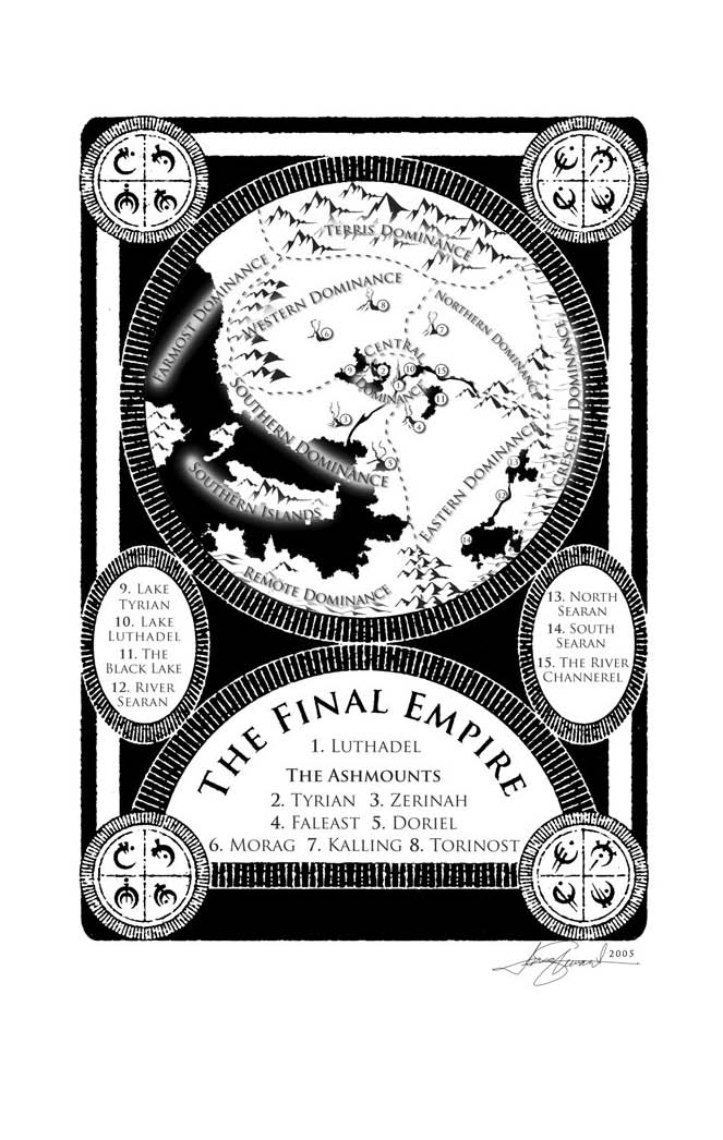 Lord Tresting frowned, glancing up at the ruddy midday sky as his servants scuttled forward, opening a parasol over Tresting and his distinguished guest. Ashfalls weren’t that uncommon in the Final Empire, but Tresting had hoped to avoid getting soot stains on his fine new suit coat and red vest, which had just arrived via canal boat from Luthadel itself. Fortunately, there wasn’t much wind; the parasol would likely be effective.