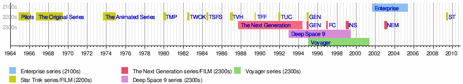 (1966–1969) Star Trek: The Animated Series (1973–1974) Star Trek: The Next Generation (1987–1994) Star Trek: Deep Space Nine (1993–1999) Star Trek: Voyager (1995–2001) Star Trek: Enterprise (2001–2005) |