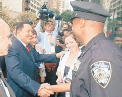 Polémico. El presidente de Venezuela, Hugo Chávez, saluda a un policía de Nueva York. El gobernante acusó a Estados Unidos de ser un ?Estado terrorista? y criticó el documento final de la asamblea de la ONU.