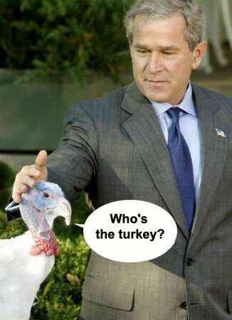Then, I read in the paper this weekend that that big turkey you were holding in Baghdad (you know, the picture that's supposed to replace the now-embarrassing footage of you on that aircraft carrier with the sign "Mission Accomplished") -- well, it turns out that big, beautiful turkey of yours was never eaten by the troops! It wasn't eaten by anyone! That's because it wasn't real! It was a STUNT turkey, brought in to look like a real edible turkey for all those great camera angles.
