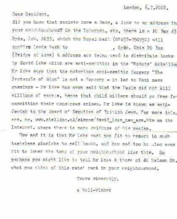 THIS IS A "LETTER" SENT ANONYMOUSLY (OF COURSE) TO THE OCCUPIERS OF HOMES