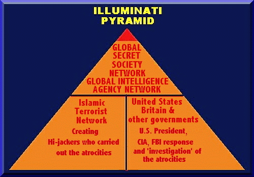 Diese Illuminati-Struktur der abgeteilten Pyramide erlaubt ihnen, grauenhafte Anschläge wie die auf New York und Washington zu organisieren während jene, die tatsächlich die Flugzeuge kaperten, keine Ahnung haben wer "Mr. Big" wirklich ist. Zum Beispiel, die CIA (ein blosses Werkzeug und oft der Schwarzer Peter für höhere Agenturen) beschaffte Geld und andere Unterstützung für die Afghan-Rebellen und Terroristen-Netzwerke, die schliesslich zum Taliban wurden während der Soviet Invasion.