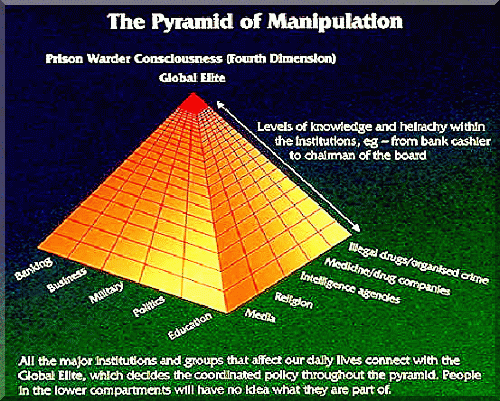 Eine "Bank"-Pyramide, zum Beispiel, ist umschlossen von grösseren Pyramiden bis Sie eine haben welche das gesamte globale Banking-System umfasst und an der Spitze davon sitzen eine Handvoll Familien-Kreuzungen, welche bis in die Antike zurückgehen und die Fäden ziehen in der Weltfinanz und manipulieren, um ihre eigene Agenda zurecht zu schneidern.