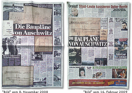 Davon, dass "Bild" (links) noch großspurig behauptet hatte, die Baupläne würden "auch die allerletzten Holocaust-Leugner" widerlegen und eine Gaskammer zeigen, in der "Menschen vergast werden sollten", steht in "Bild" (rechts) nichts mehr.