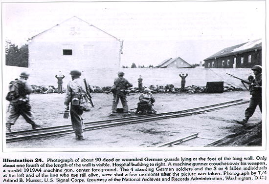 "When the Americans captured Dachau, the guards all surrendered. They were taken into a large group and lined up against a wall. Suddenly, shooting with machine guns started. The two prisoners were in a rear rank. When dead men behind them fell on them, they lay among the bodies and in that way survived. They later wandered off and were picked up by some unit of the American division and brought to the collection point. (23-5636, 5637)"