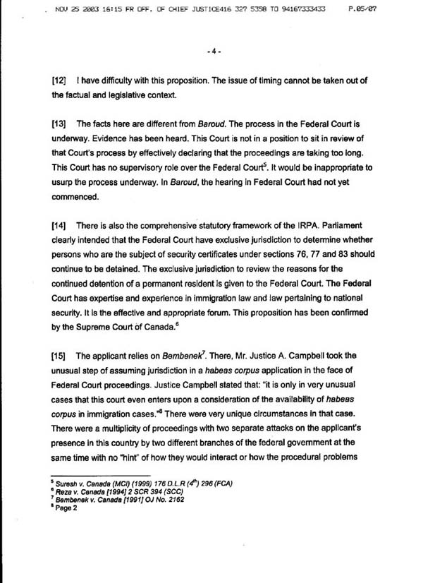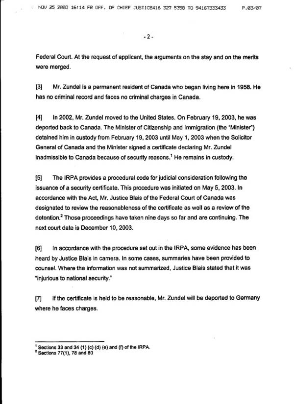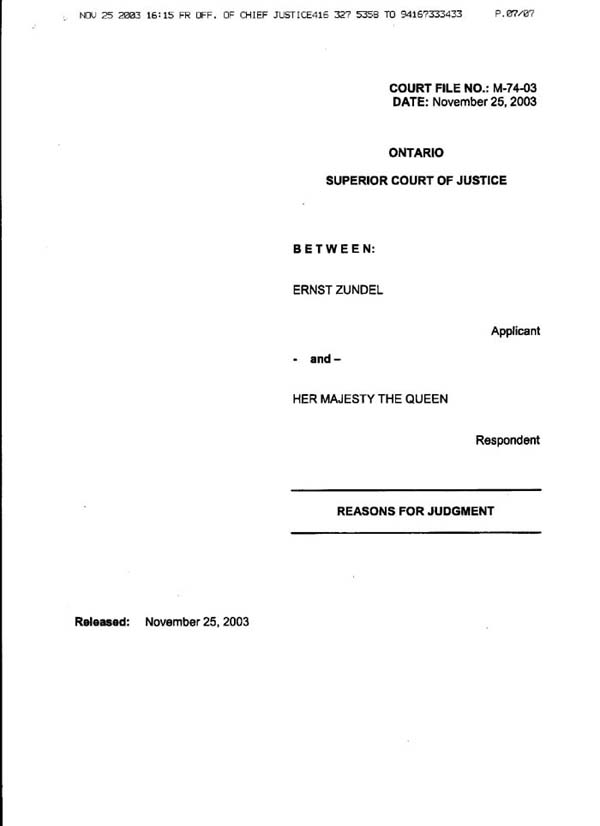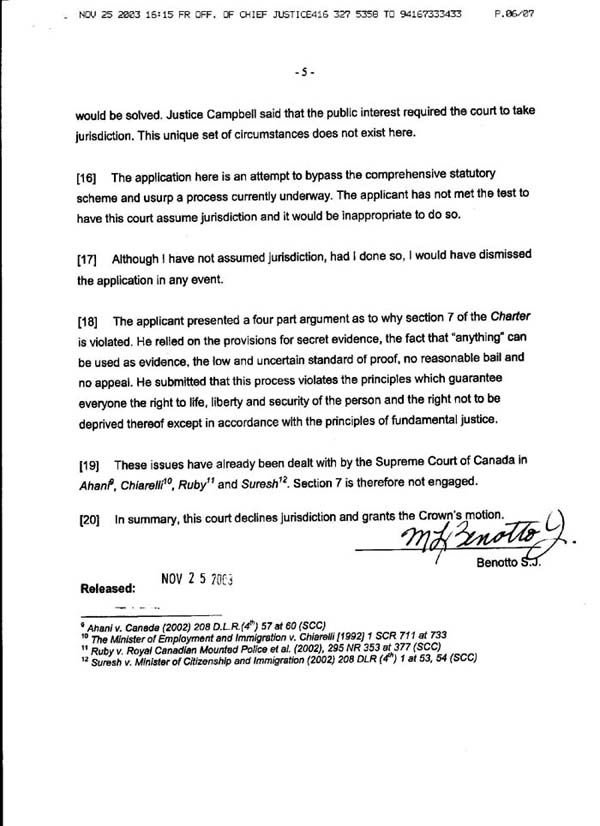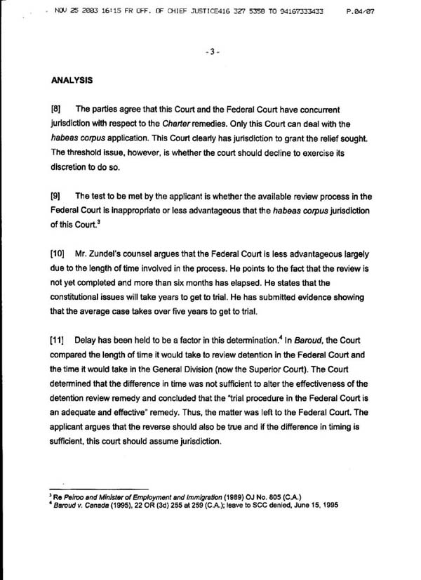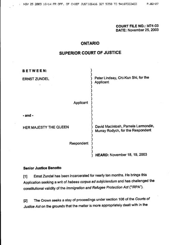 Decision of Senior Justice Mary Lou Benotto on habeas corpus ad subjiciendum motion filed by Ernst Zundel