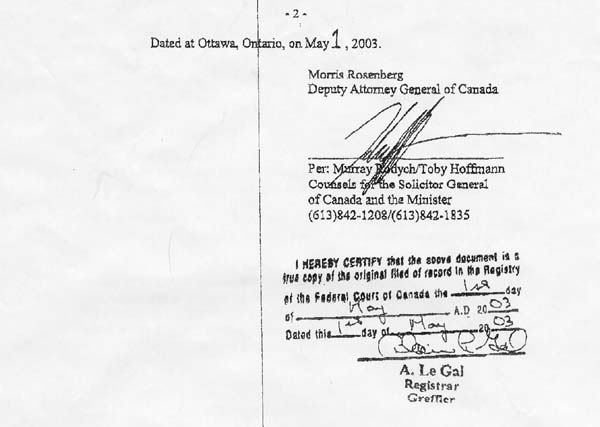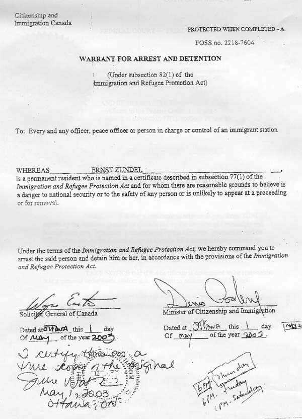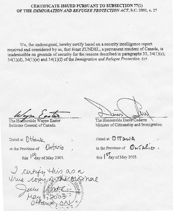 The actual "Security Certificate" [Section 77(1)]  and Warrant for Arrest and Detention of Ernst Zündel, signed by the Ministers Responsible