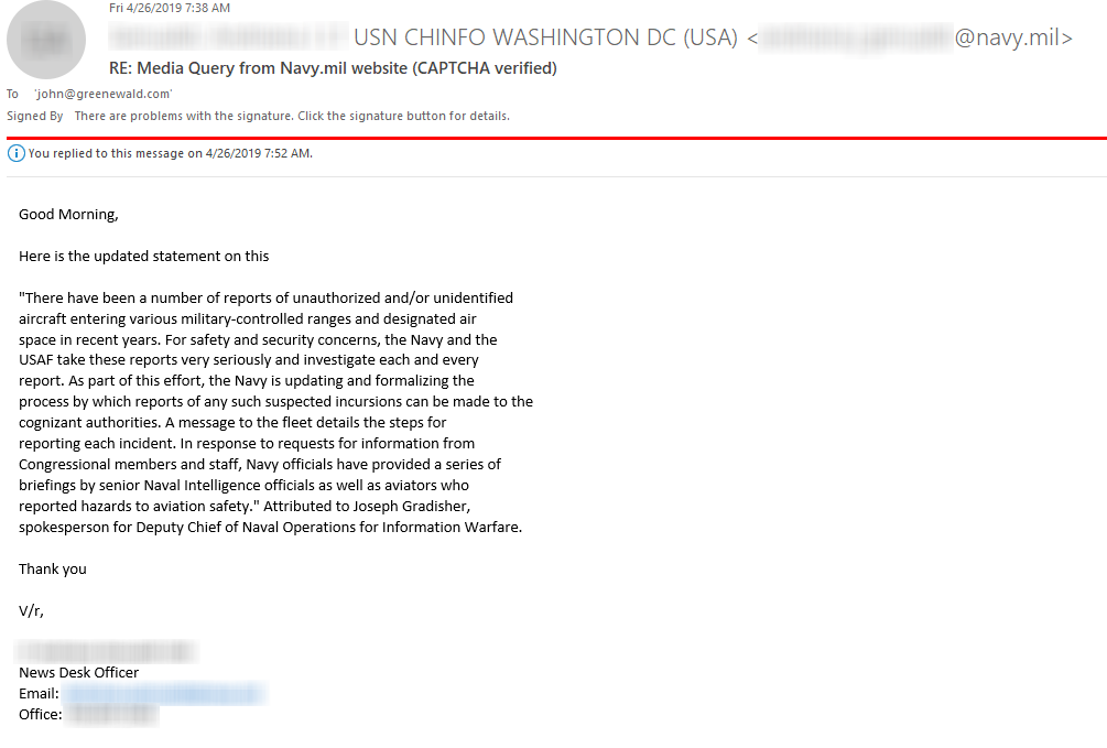 In 2019, the NY Times reported multiple Naval encounters with UFOs. And although evidence exists they tried to verify that on an official level, The Black Vault just received documents that show they may not have been able to.