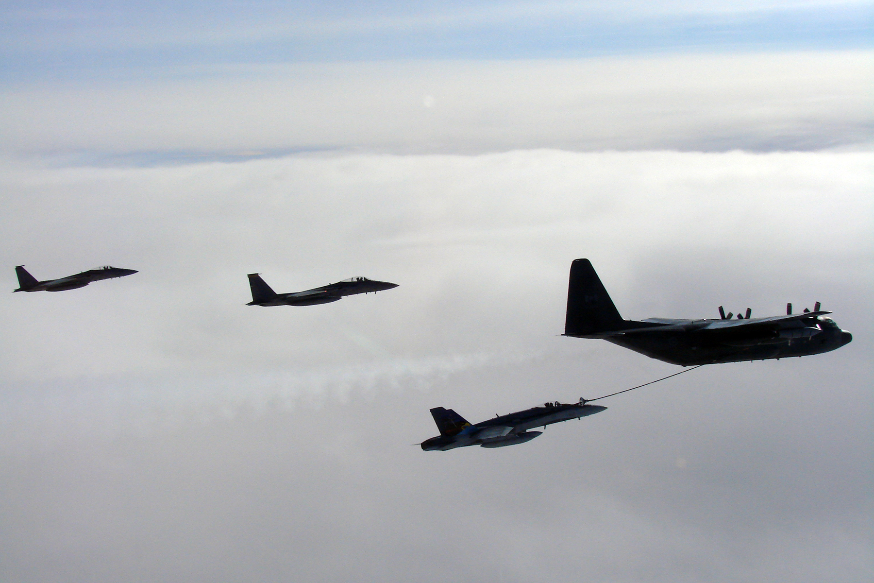 A CF-18 Hornet tops up its tanks from a CC-130T Hercules, both from the Canadian North American Aerospace Defense Command Region, while two F-15 Eagles from Elmendorf Air Force Base, Alaska, fly nearby. The aircraft were in the Canadian north in March 2007 to practice joint long-range detection missions and other NORAD procedures.