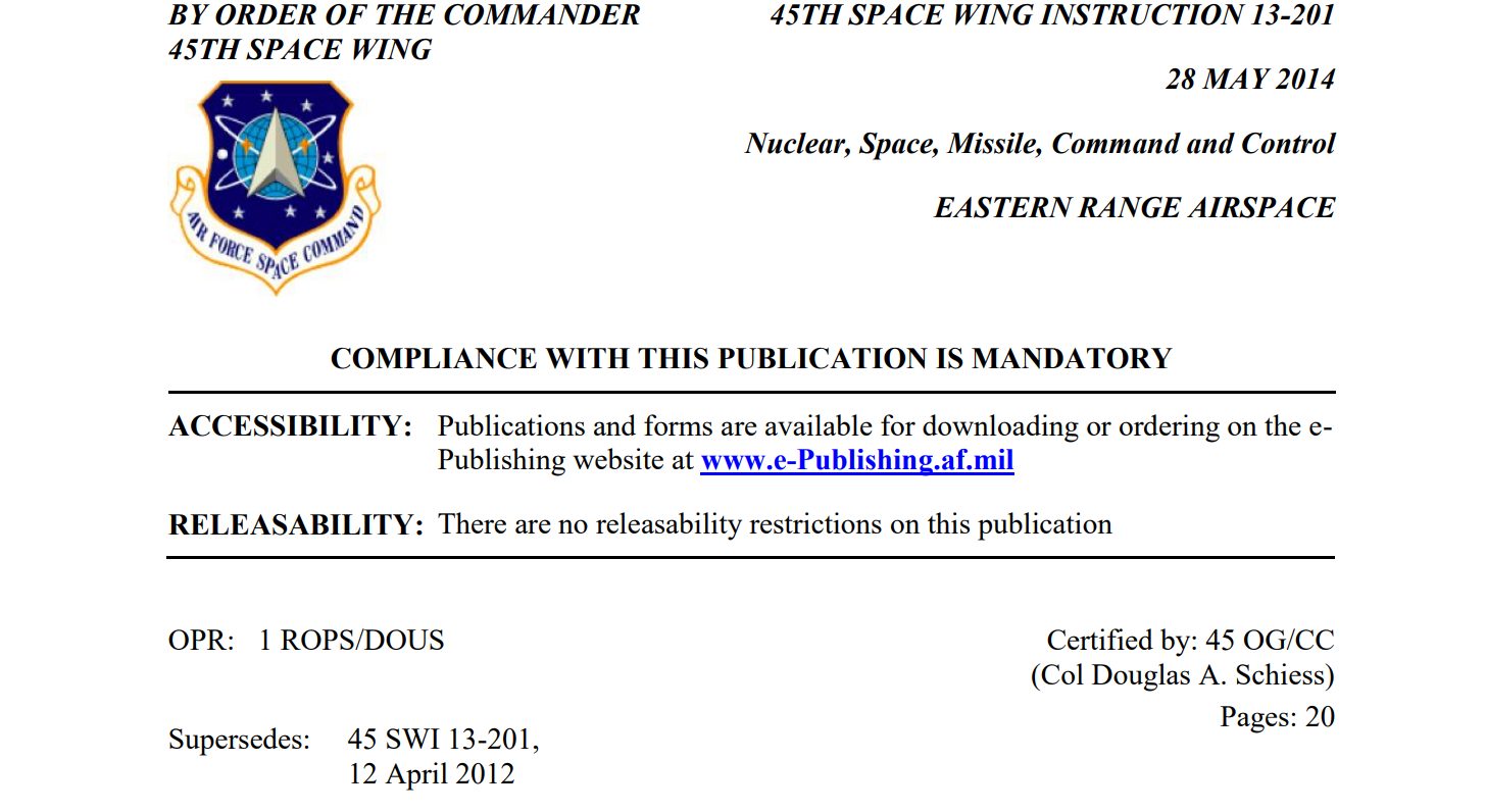 DOWNLOAD 45th Space Wing Instruction 13-201 – 28 May 2014 [20 Pages, 1.2MB]