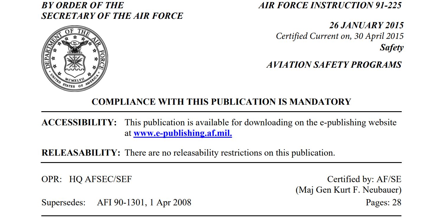 DOWNLOAD Aviation Safety Programs, Air Force Instruction 91-225 – 30 April 2015 [33 Pages, 0.8MB]
